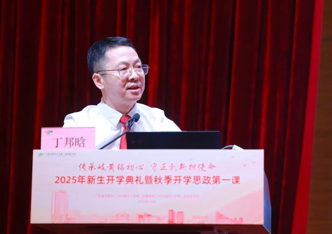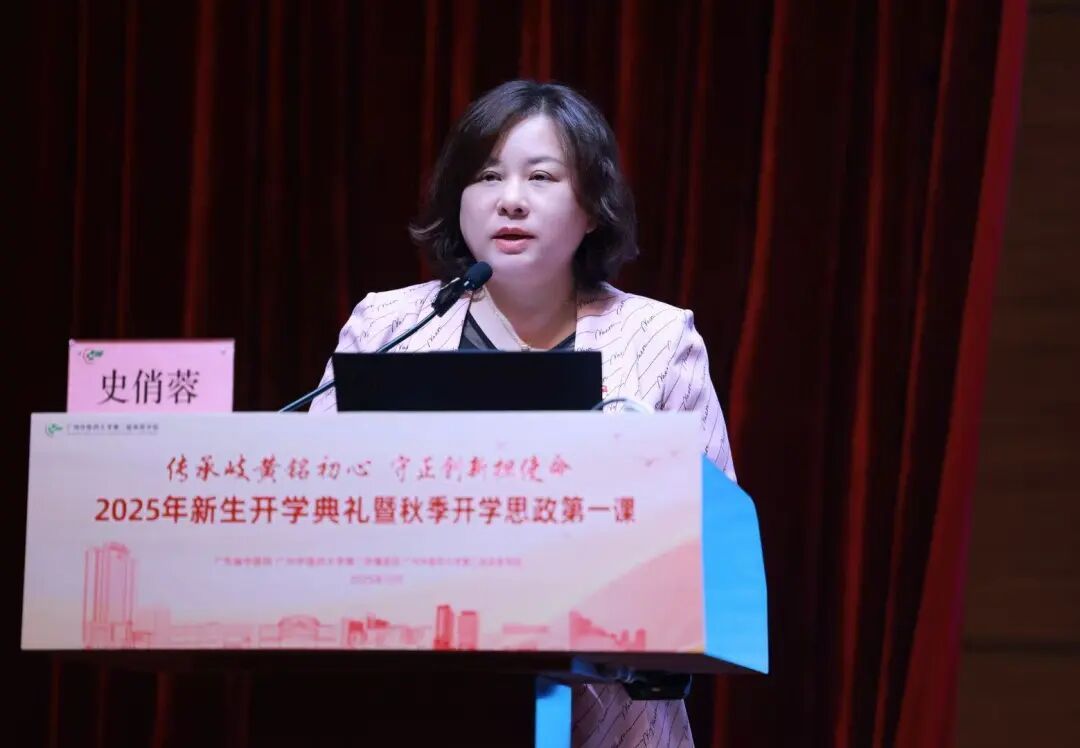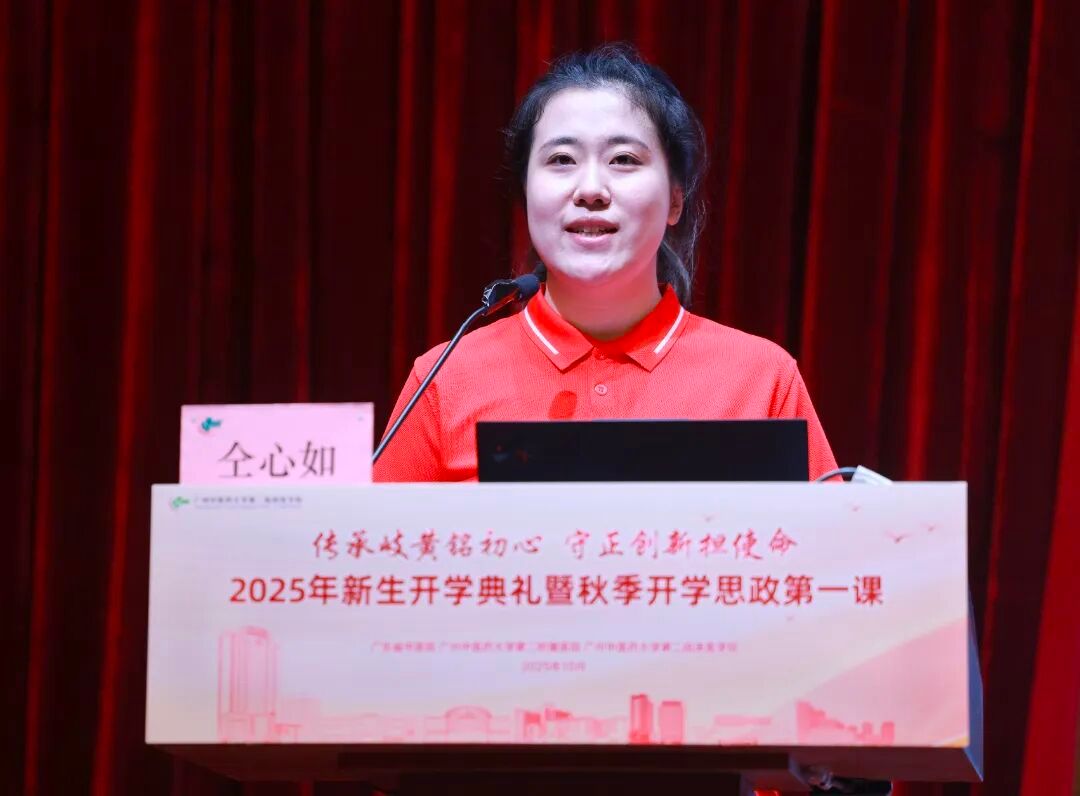 史俏蓉书记代表学院党委对2025级新生表示欢迎。她指出,广东省中医院是素有“南粤杏林第一家”美誉之称的杏林学府,被国医大师邓铁涛教授赞誉为“铁杆中医的黄埔军校”。学院以培养“高出一格”的中医药人才为目标,希望新生们既要深入研读经典理论,筑牢专业根基,又要积极投身临床实践,做到知行合一;既要坚守中医药文化精髓,又要勇于拥抱现代科技,探索中医药与现代科学融合发展的新路径。