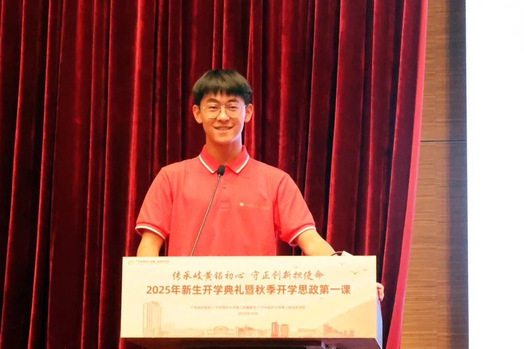2025级中医学专业九年制学生蔡含章作为新生代表发言,他分享了初入杏林的喜悦。他立誓将在未来的岐黄征程中格物致知、砥砺前行,为成长为优秀中医药人才而不懈奋斗。