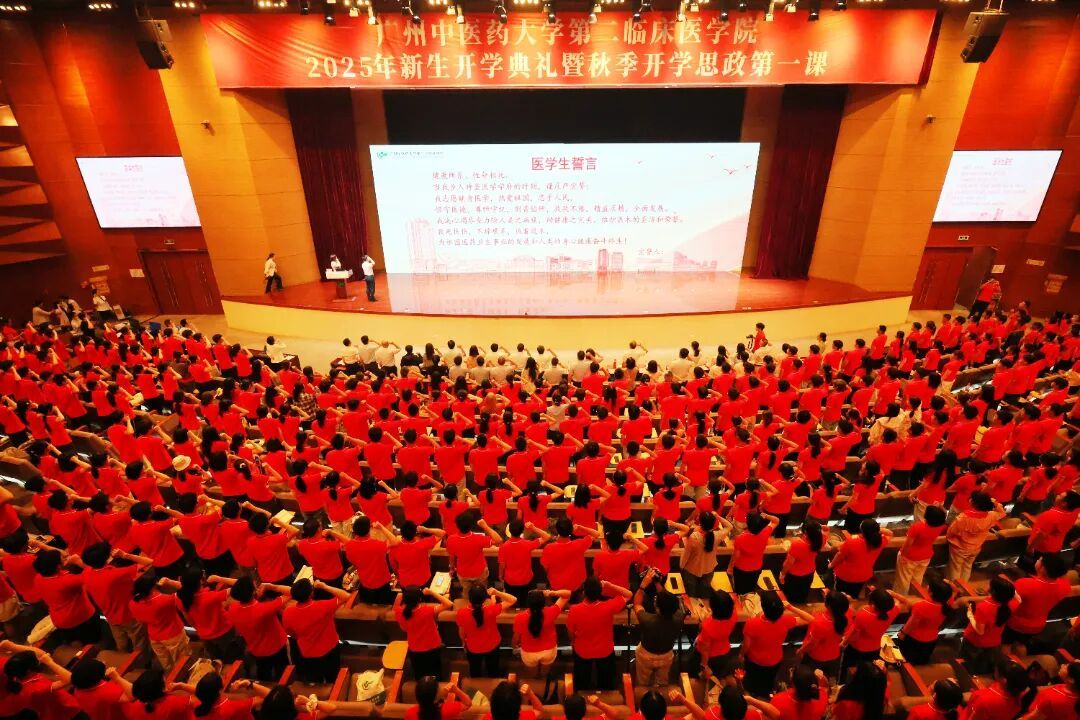 广州中医药大学党委常委、副校长,第二临床医学院院长、党委副书记张忠德,第二临床医学院党委书记史俏蓉,学校教务部部长朱磊、研究生院院长徐建华、团委书记王烁,学院部分班子成员、职能部门负责人及2025级全体新生参加开学典礼。学院党委副书记谭利斌主持活动。