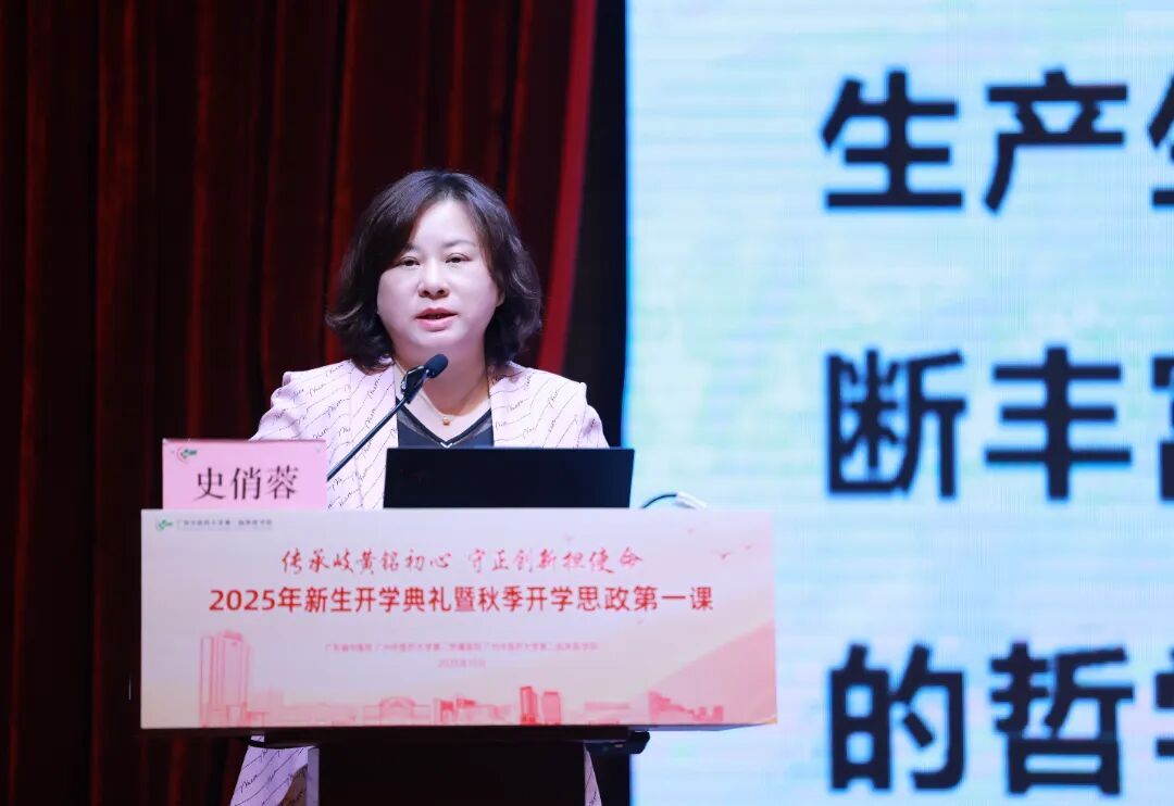 史俏蓉书记以《坚定文化自信,勇担中医使命——新时代第二临床医学院学子的使命担当》为题进行授课。首先,她希望同学们要坚定文化自信,铸就中医药振兴之魂。中医药是中华文明的瑰宝,我们要深刻认识其价值,坚定传承创新的文化自觉。其次,同学们要读懂医院百年史,凝聚青春奋进力量。广东省中医院近百年发展史,是一部秉承“上医医国、先觉觉民”精神,坚守“开放包容,敢为人先”品格的奋斗史。我们要将这部波澜壮阔的院史作为砥砺前行的生动教材,向先辈和榜样对标看齐。第三,同学们要勇担中医药复兴使命,书写新时代精彩华章。希望大家志存高远,厚植家国情怀;修身立德,做苍生大医;学贯中西,成为复合型人才;珍惜韶华,提升综合素质,在推动中医药振兴发展的伟大事业书写无愧于新时代的青春画卷!