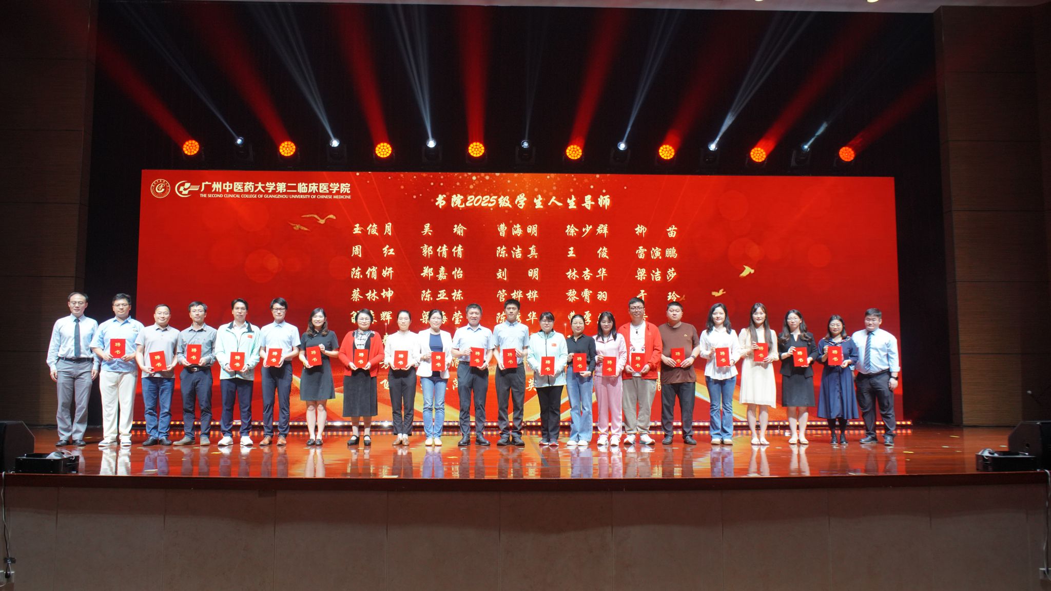 2025年11月1日下午,广州中医药大学第二临床医学院在广东省中医院大学城医院科学院一楼学术报告厅隆重举行书院导师聘任仪式暨迎新文艺汇演。学院党委副书记谭利斌、组织人事处处长张燕、团委书记何仲奎、党委办公室副主任徐胜、医务处副处长李志尚、后勤管理处副处长林毓霞、教育处(学生工作处)副处长黄彬、书院人生导师代表及2025级全体新生参与活动。